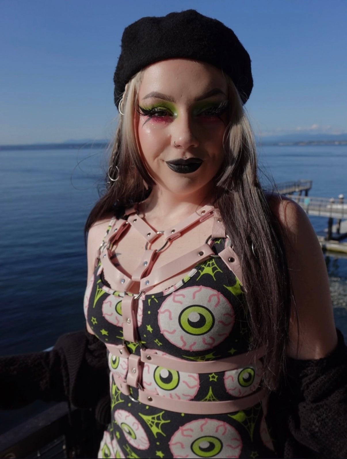 This is a Fashion Harness i made titled "Revival" and it is made from a thick and comfy Vegan/ Faux Leather. It will best fit size US womens SM/MD and is slightly adjustable on the shoulder straps and the horizontal straps in the back.