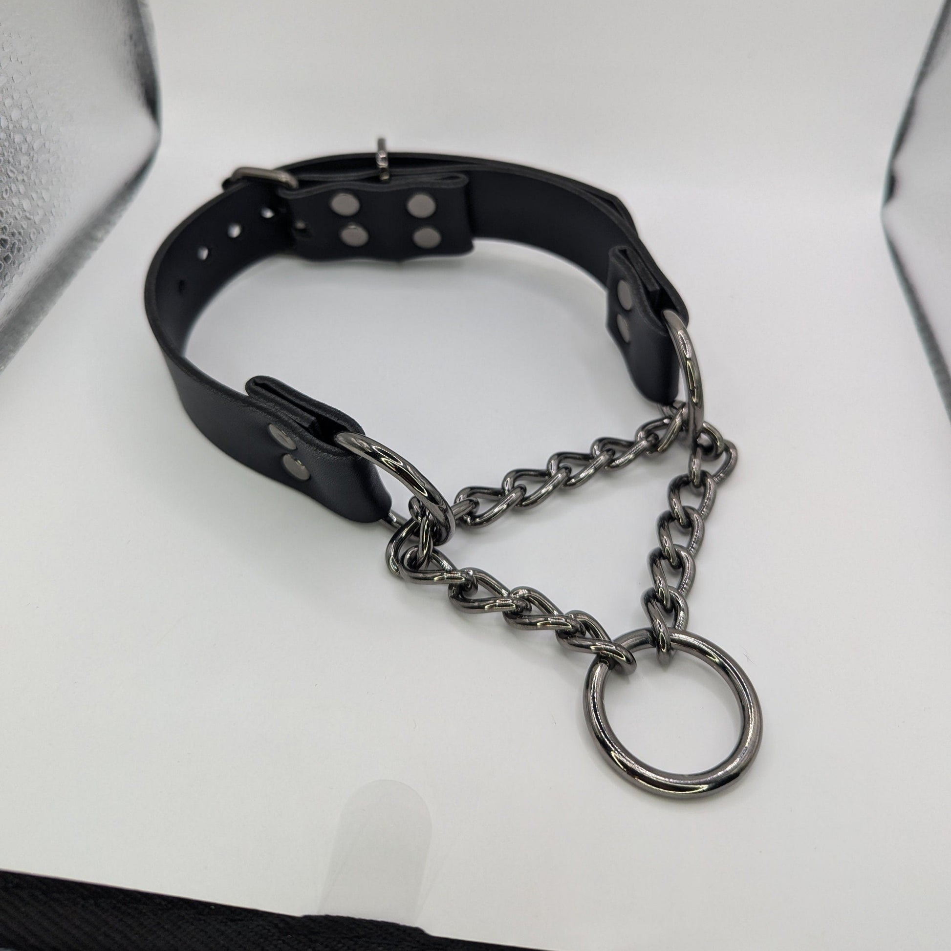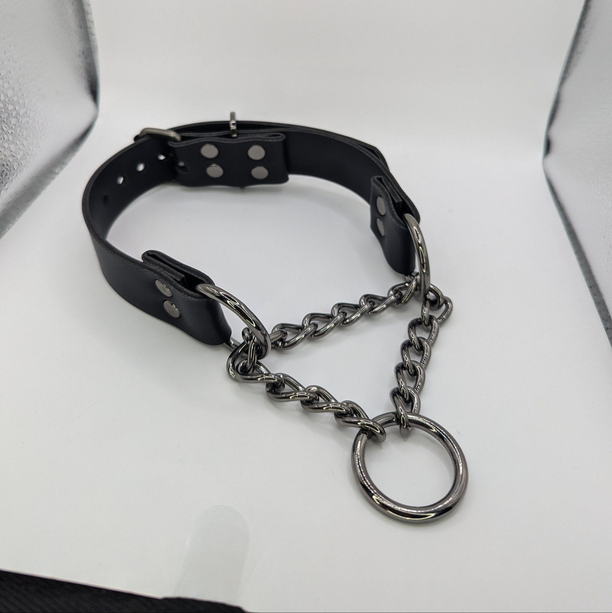 This is a handmade choker featuring a GunMetal/ Dark Silver , sturdy Martingale/ Pull chain. Metal is Plated Stainless Steel. This is available to be made in Genuine Leather or Vegan Leather. Leashes are also available in my shop :) Be sure to find me on instagram to see more of my work :) @_SxbjectDelta_
