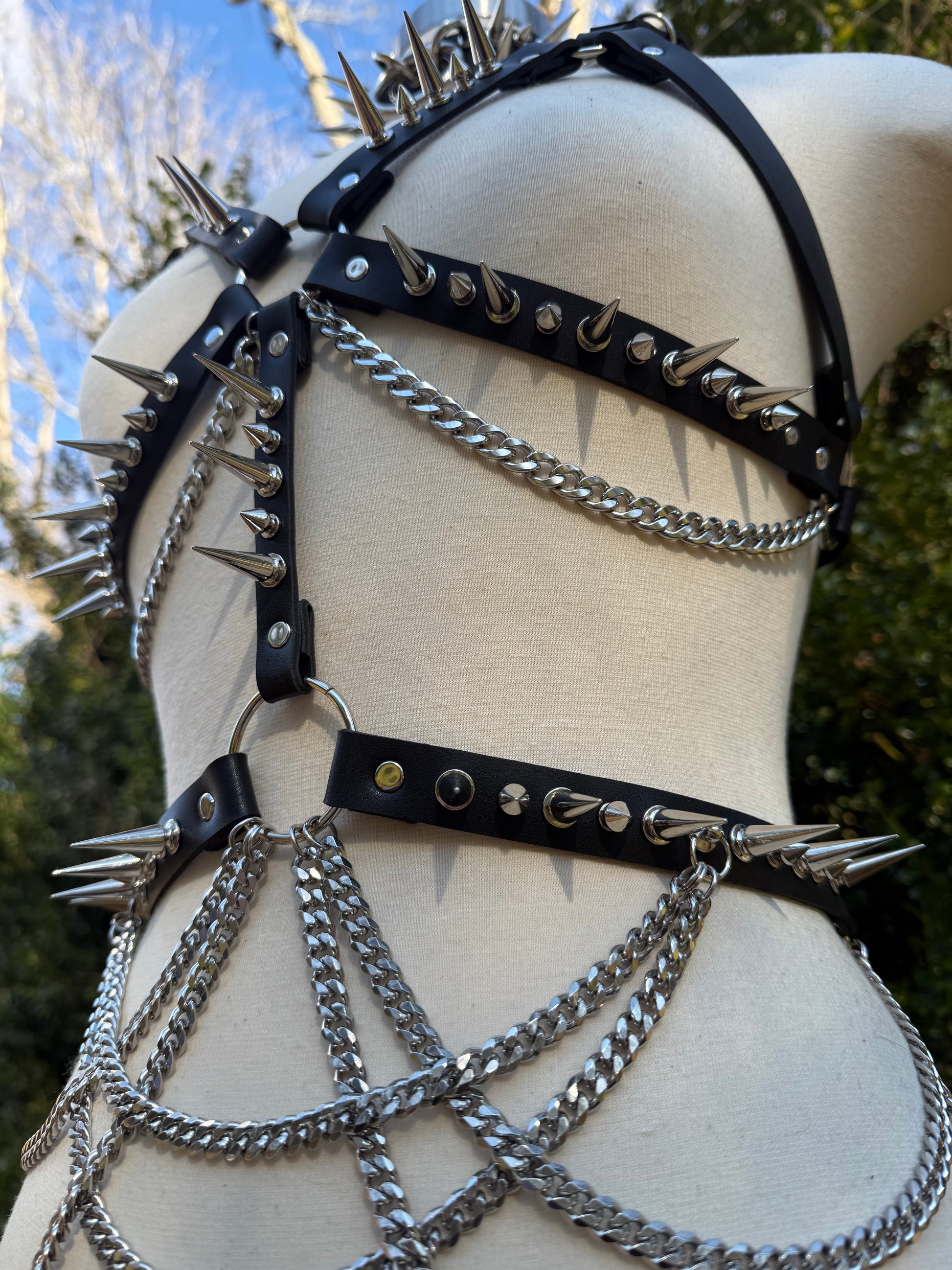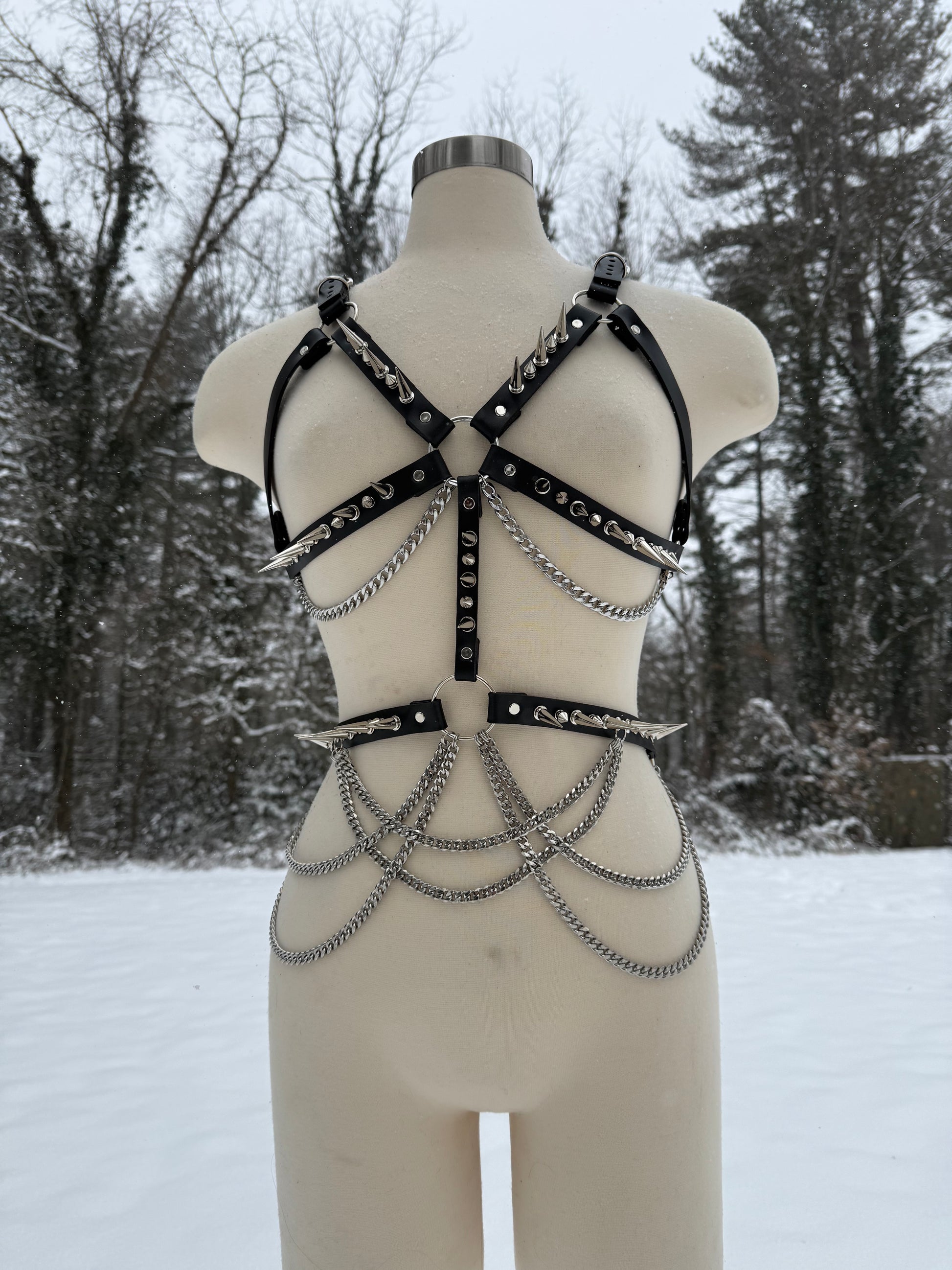 This is my most intricate design yet for a fashion harness and was my first creation of 2026 :) this design is made from a thick and comfortable Vegan/Faux Leather, and features 1-inch long spikes along it, as well as a chain belt made from stainless steel chains. This design will best fit a size small-medium, but I can make adjustments if we discuss prior to purchase :)